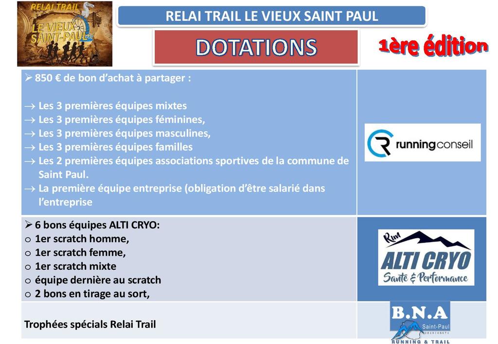 bonjour à tous le relai trail vieux saint paul organisé par bna se déroulera le samedi 21/12 voici les dotations pour ceux qui hésitent encore :) A partager un max les amis